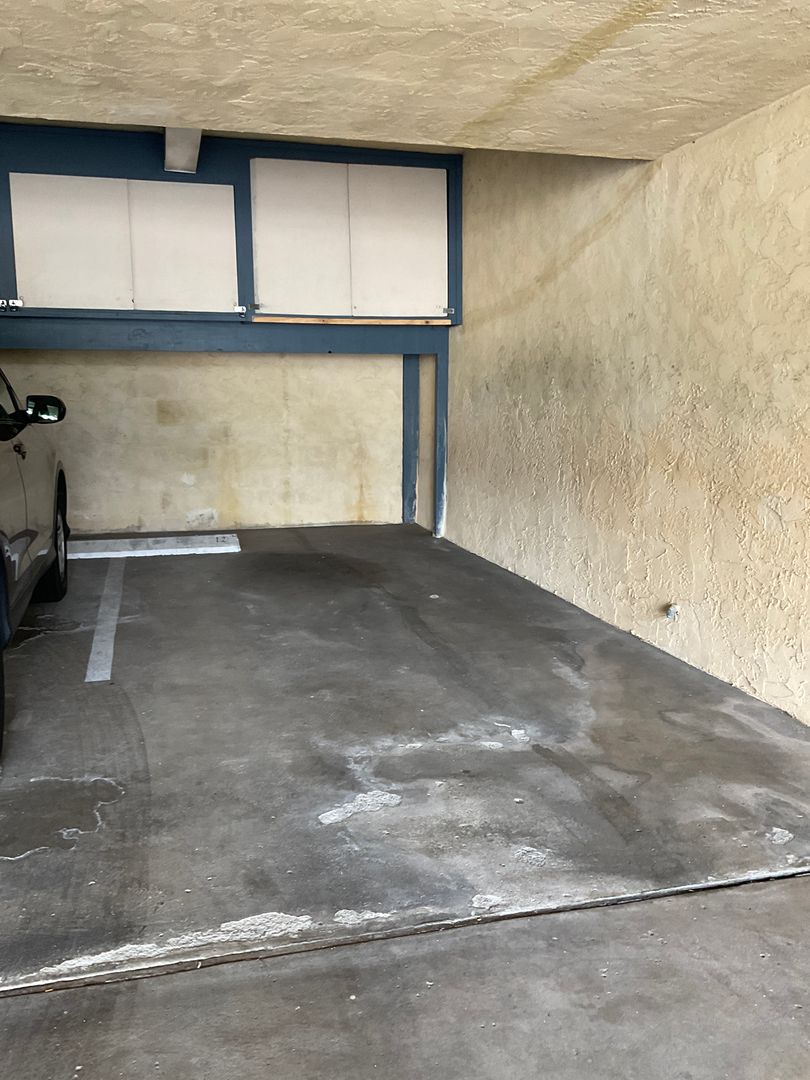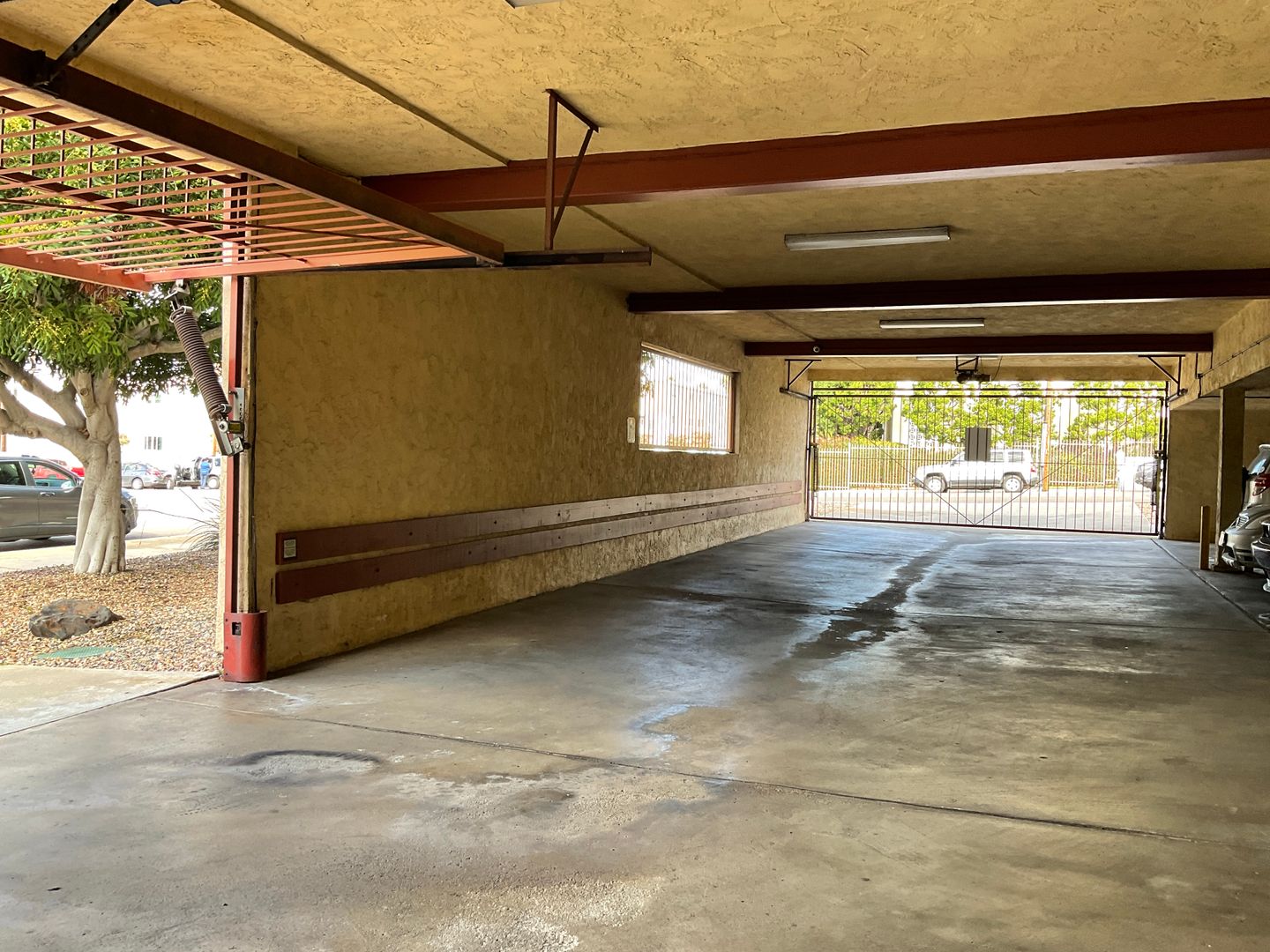 1 assisgned parking inside the gated garage with overhang storage as well. Plenty off street parking and additional parking spots behind that is another options.