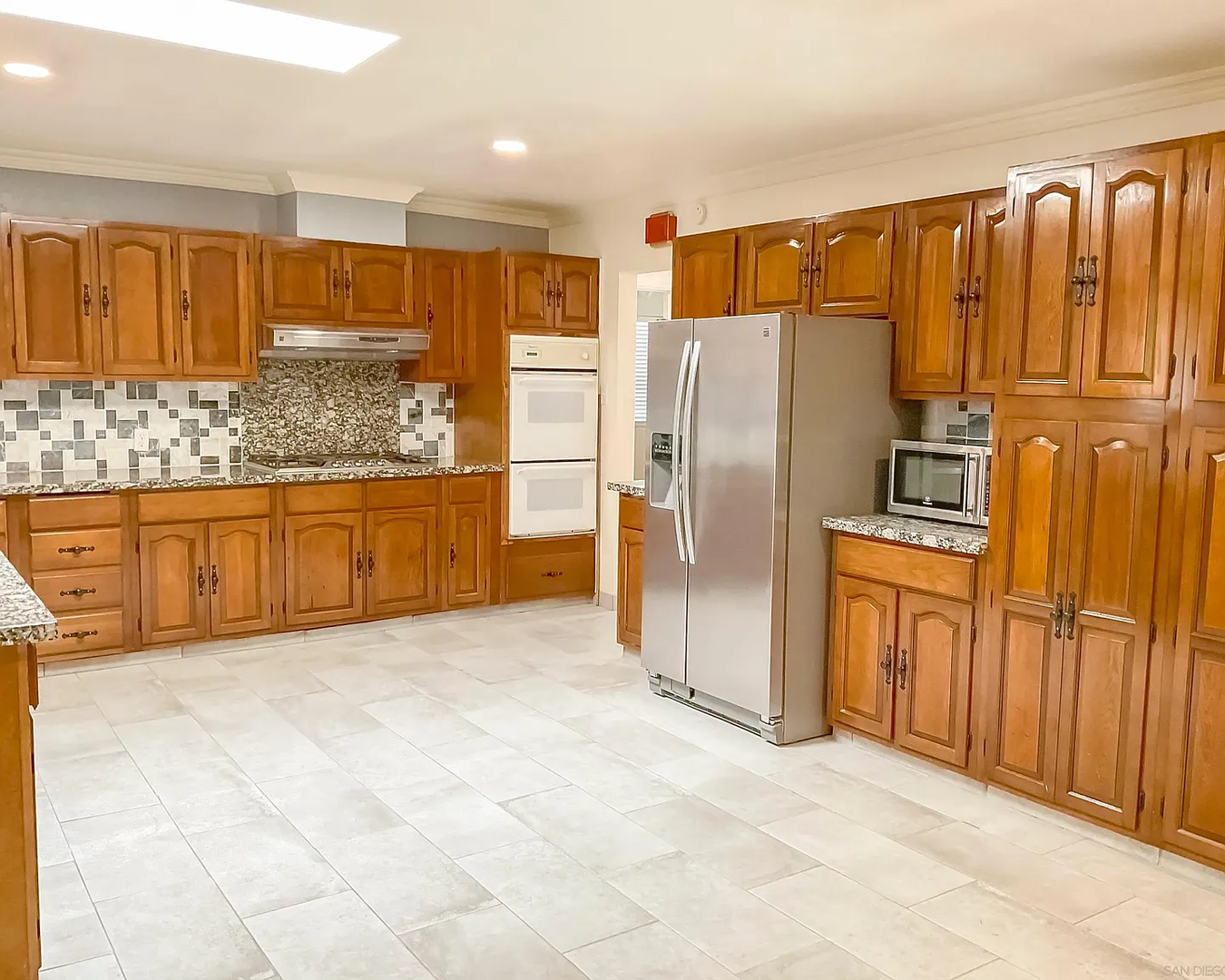 Kitchen with granite countertops, lots authentic wood cabinets space, and skylights!
