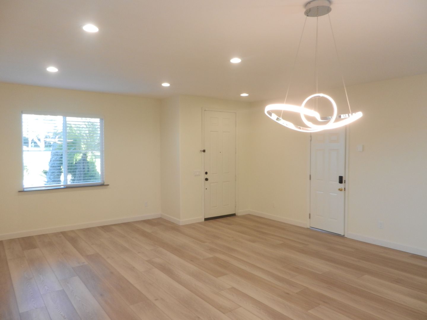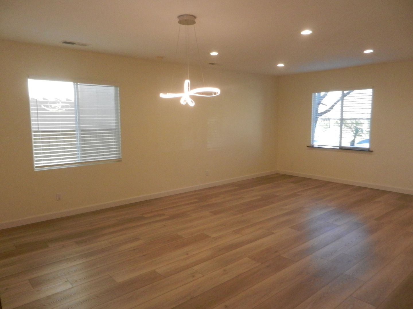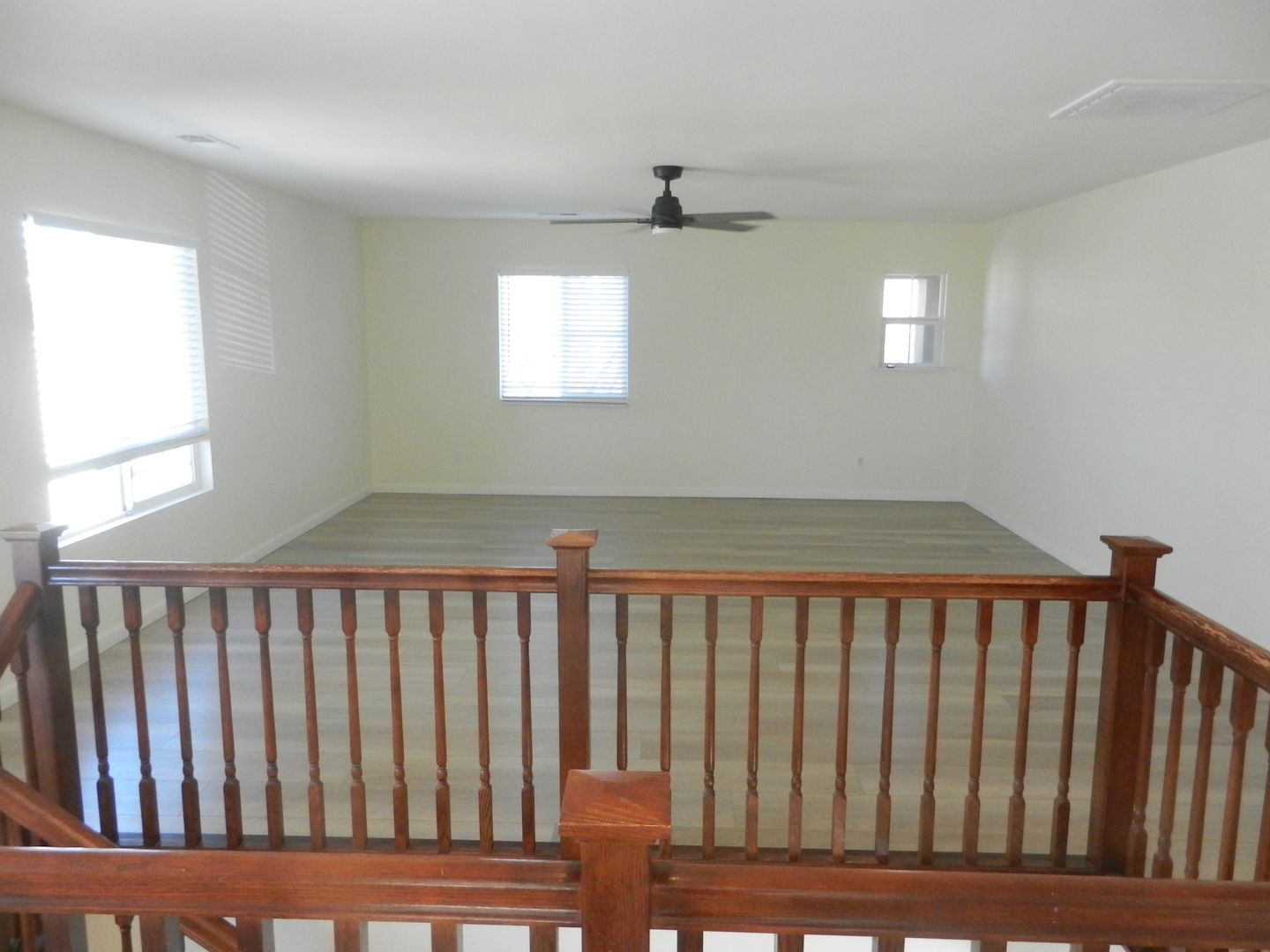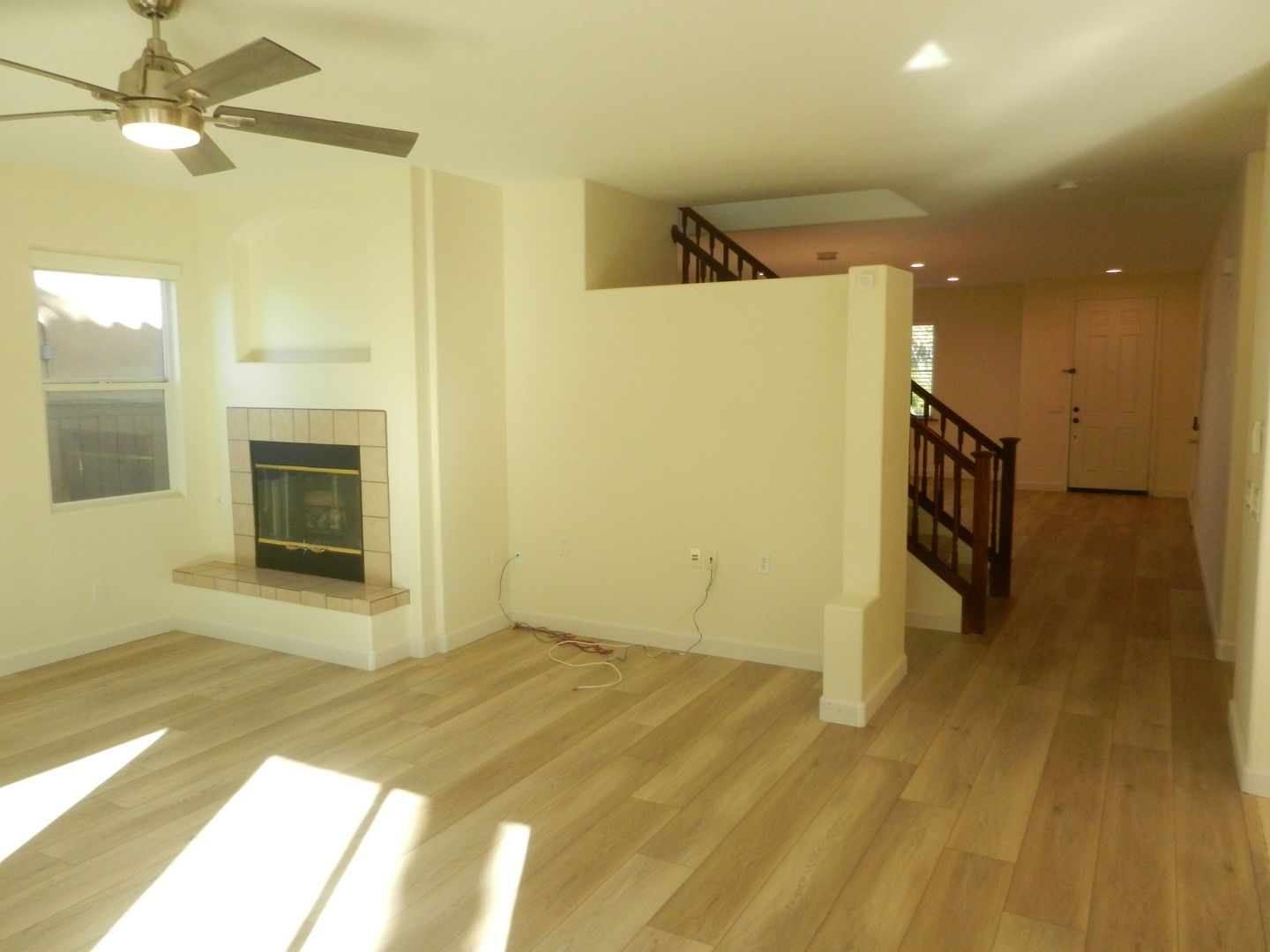 Laminate wood flooring downstairs that compliment the upgraded staircase railing.