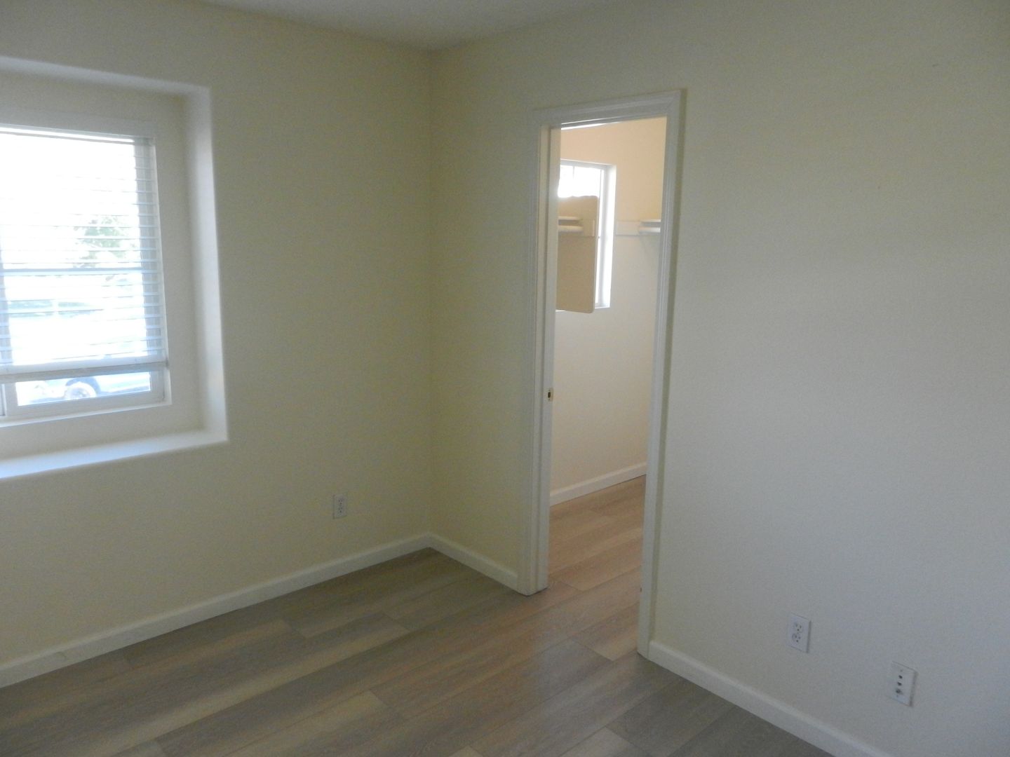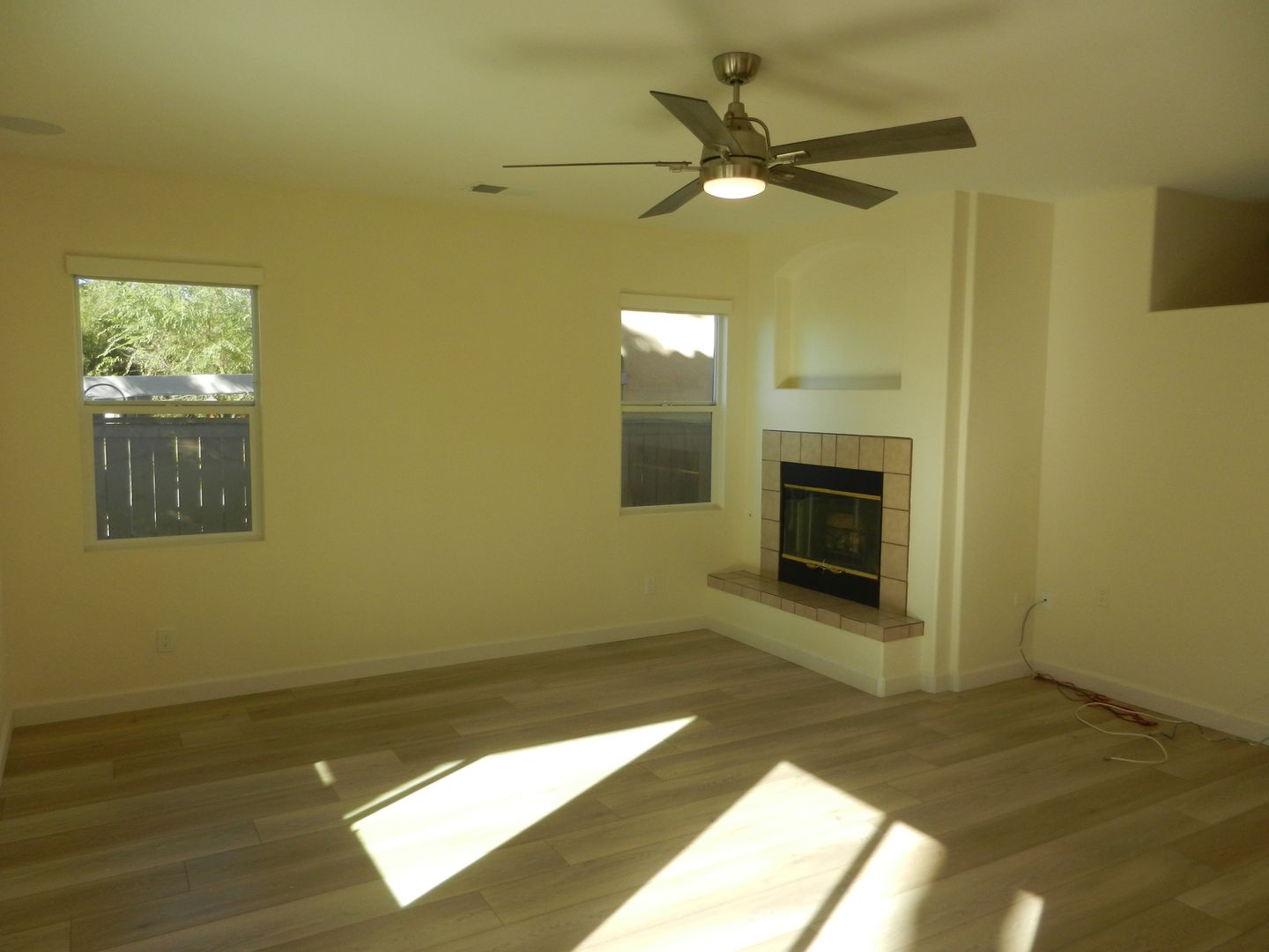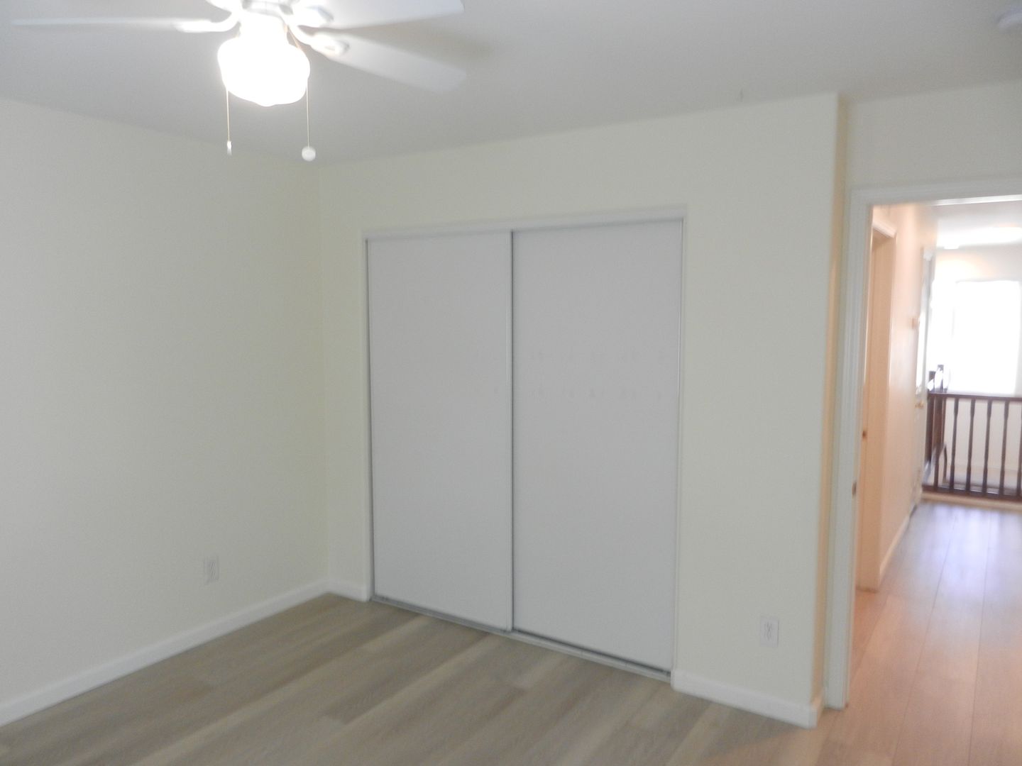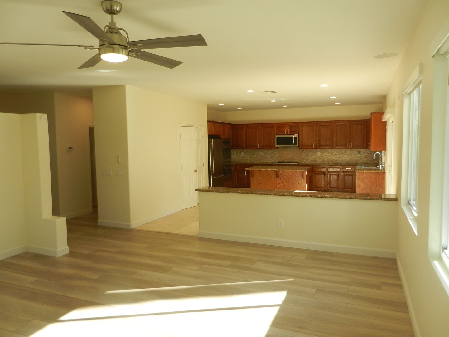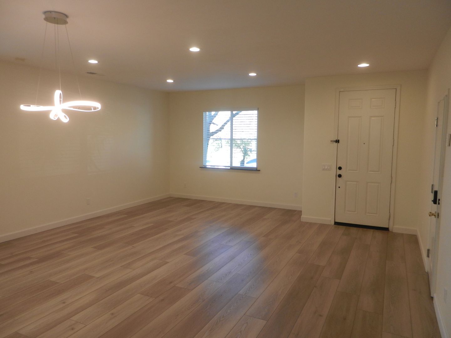 Laminate wood flooring downstairs that compliment the upgraded staircase railing.