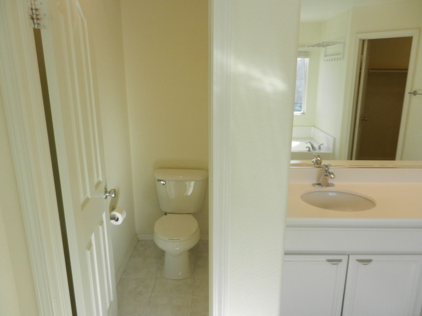 Master Bath offers two large walk-in closets, dual sinks, white vanity, soaking tub & shower.