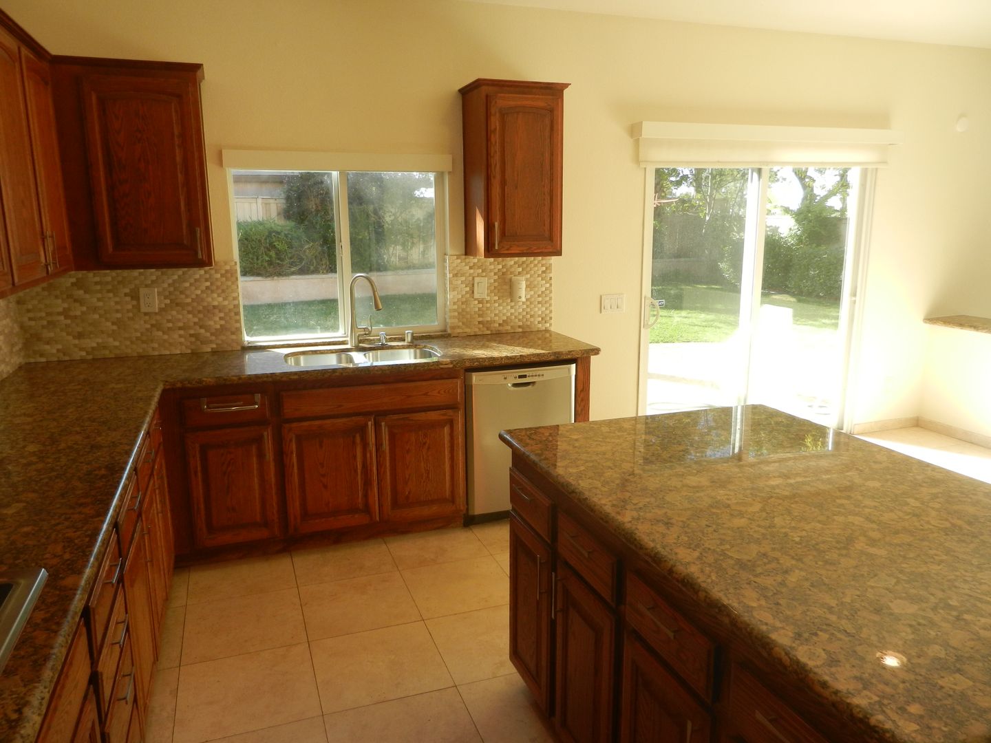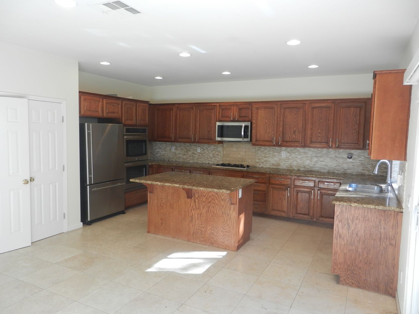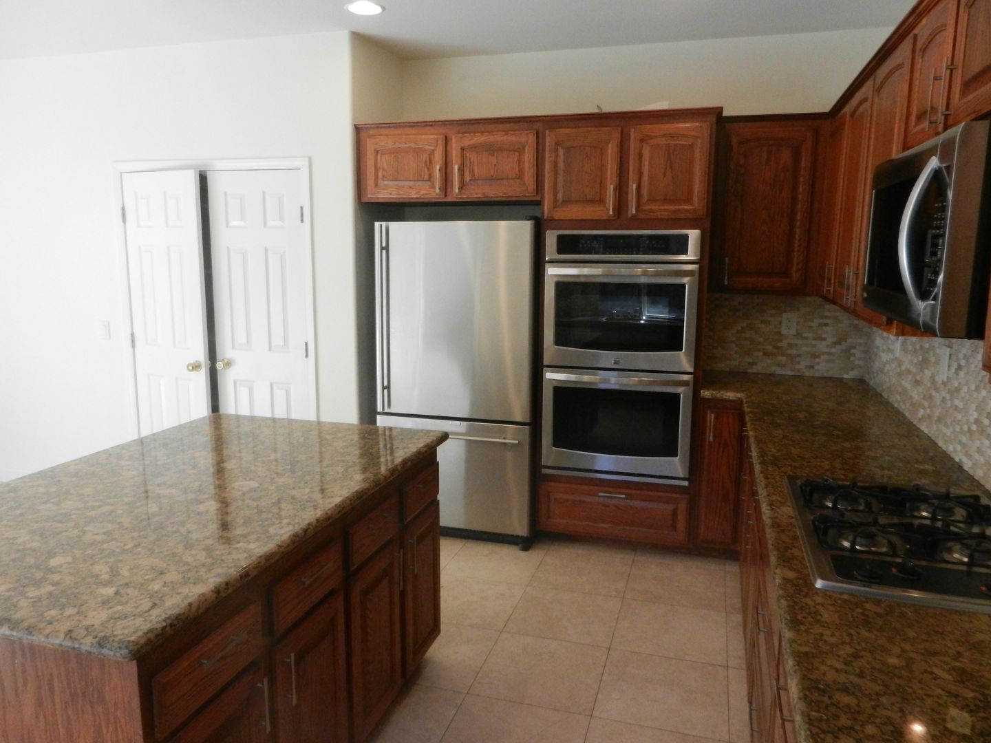 Impressive remodeled kitchen w/rich wood cabinetry ¢ter island, granite counters, stone backsplash, walk-in pantry and newer appliances including double ovens!