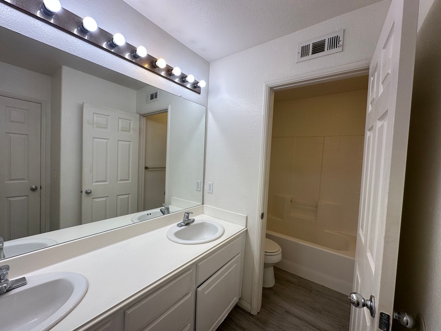 Guest bath also offers his and her sinks + a shower and tub combo.